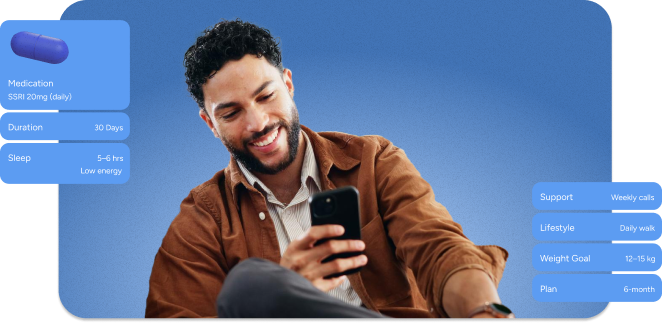We start with a full health and lifestyle review — everything from your current dose and appetite patterns to your daily routine. From there, your prescriber builds your personalised taper or continuation plan. Your nutrition, behaviour, and fitness coaches create your support framework around that. Over six months, your plan adapts as you do — so every change is reviewed, explained, and managed by professionals who monitor your progress closely. Nothing is left to guesswork.